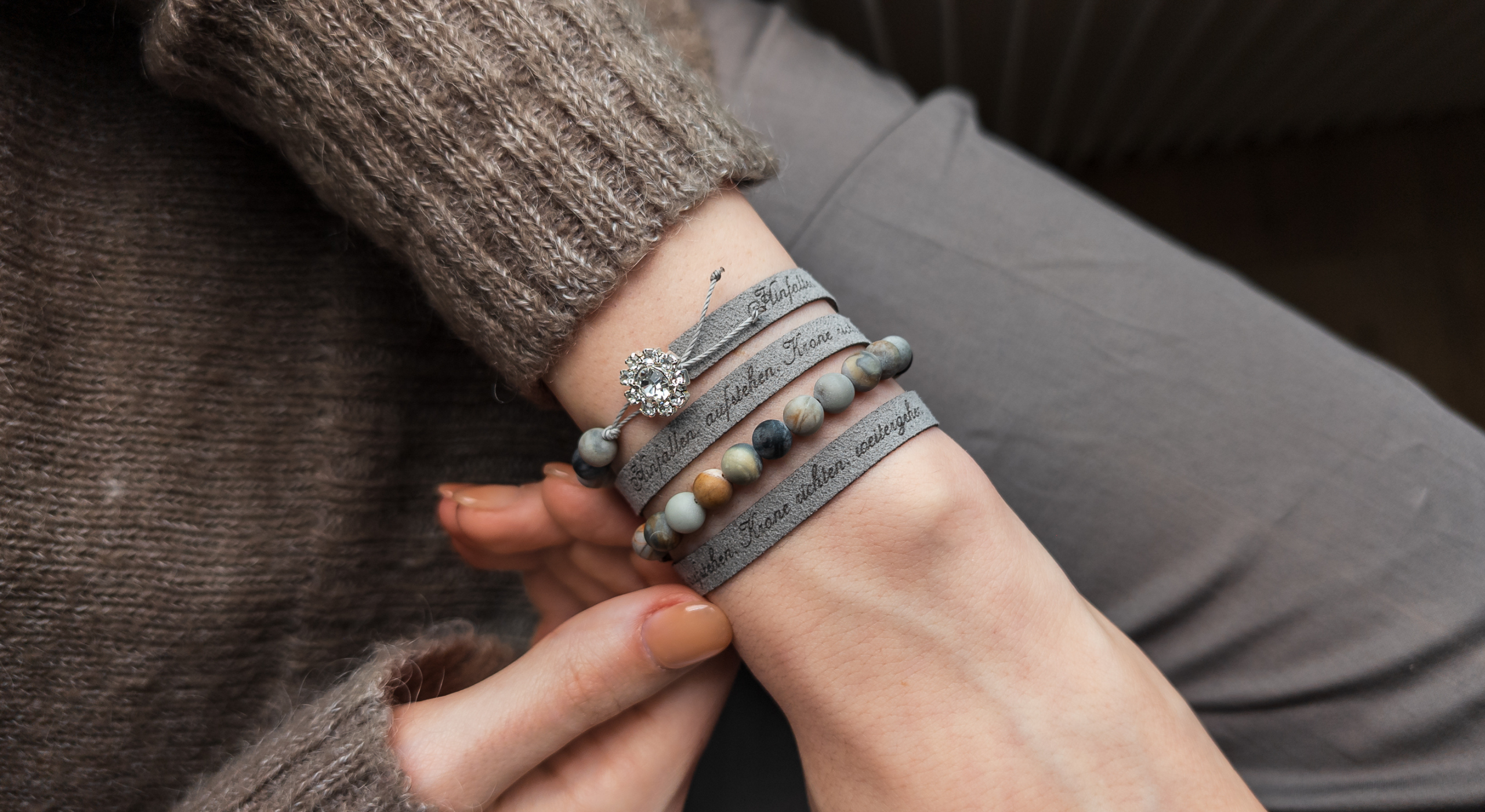 Our bracelets carry messages that help quiet the mind—making space to pause and breathe.